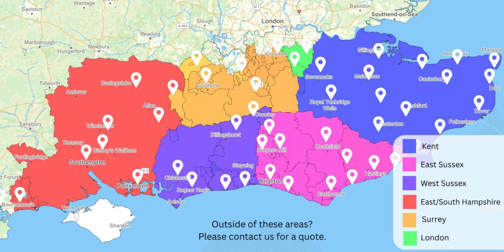 Zonas en las que prestamos servicio: Croydon, Horley, Farnham, Basingstoke, Burgess Hill, Southampton, Eastleigh, Portsmouth, Fareham, Havant, Chichester, Bognor Regis, Worthing, Lancing, Hove, Brighton, Epsom, Guildford, Woking, Haywards Heath, Lewes, Hailsham, Hastings, Eastbourne, Royal Tunbridge Wells, Maidstone, Dartford, Horsham, Peacehaven, Seaford, Waterlooville, Shoreham-by-Sea, Lindfield, East Grinstead, Redhill, Pevensey Bay, Crawley, Littlehampton.